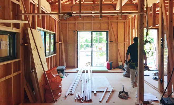 伊藤工務店の伊藤です。突然暑くなった5月末頃、丸森S邸は建て方の工事が進んでいました。(たてかた:構造体の組み立て)無事に上棟し、現在は弊社の大工と屋根や電気の業者さんが入り工事がすすんでいます。※写…